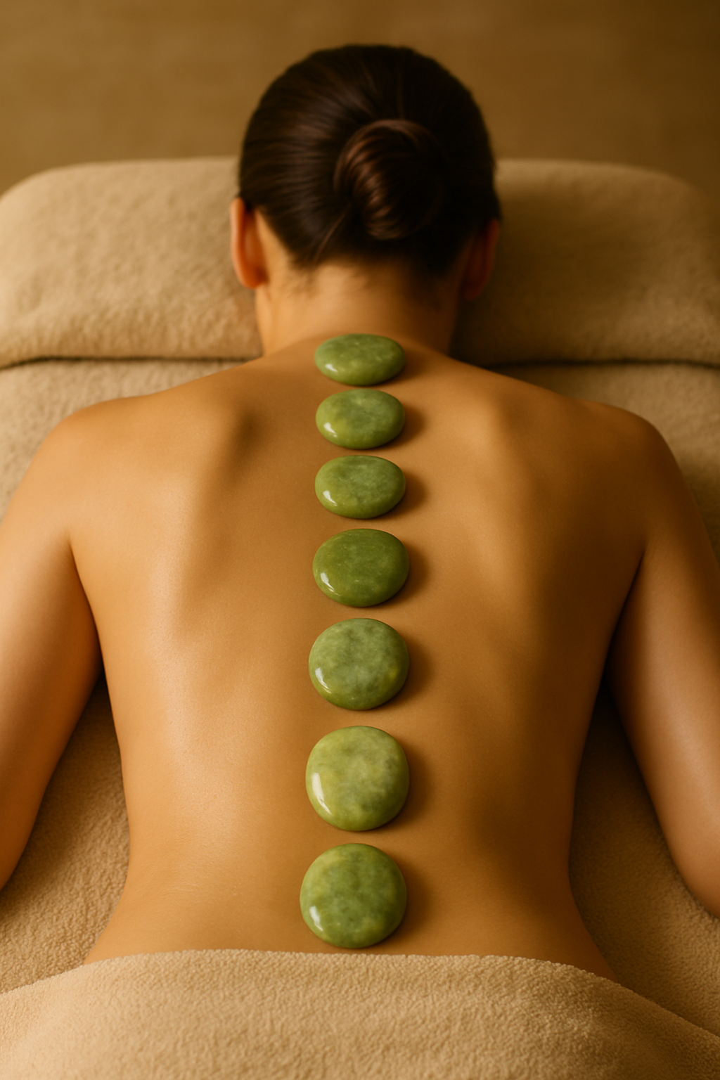 Las piedras calientes de jade se deslizan por la espalda, piernas y brazos liberando